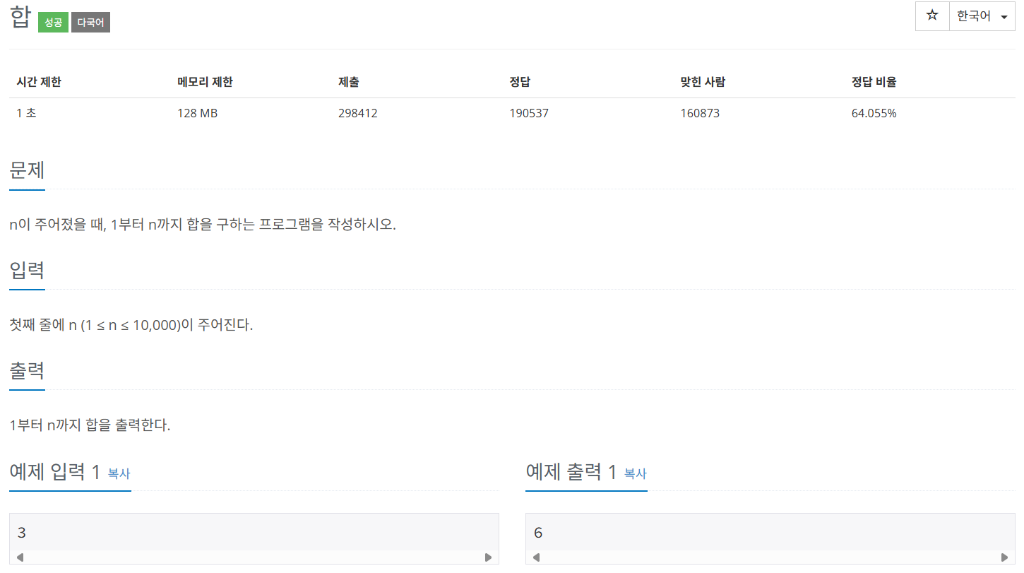 예제로 3이 주어지면, 1+2+3, 즉 6을 출력하면 성공인 문제이다.