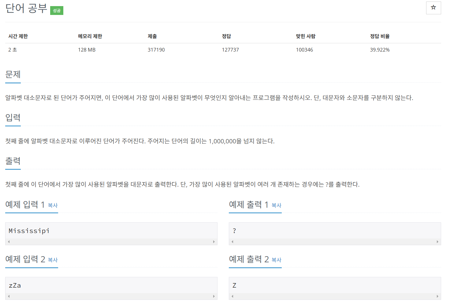 이번 문제는 이해하기 쉽다. 어떤 문자가 주어지면 그중에서 가장 빈도수가 큰 알파벳을